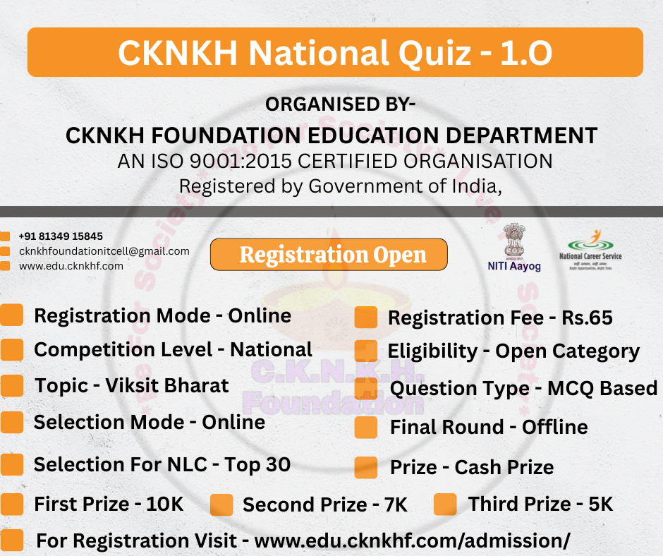 The CKNKH National Quiz 1.0 is a flagship event under the Chalo Kuch Niyara Karte Hai Foundation’s annual program, “CKNKH Udaan Utsav.” Organized by the foundation’s departments and committees, this prestigious national-level quiz competition aims to foster academic excellence and innovation among students, commencing with the academic year 2025-2026, under the auspices of the CKNKH Foundation’s Education Department.